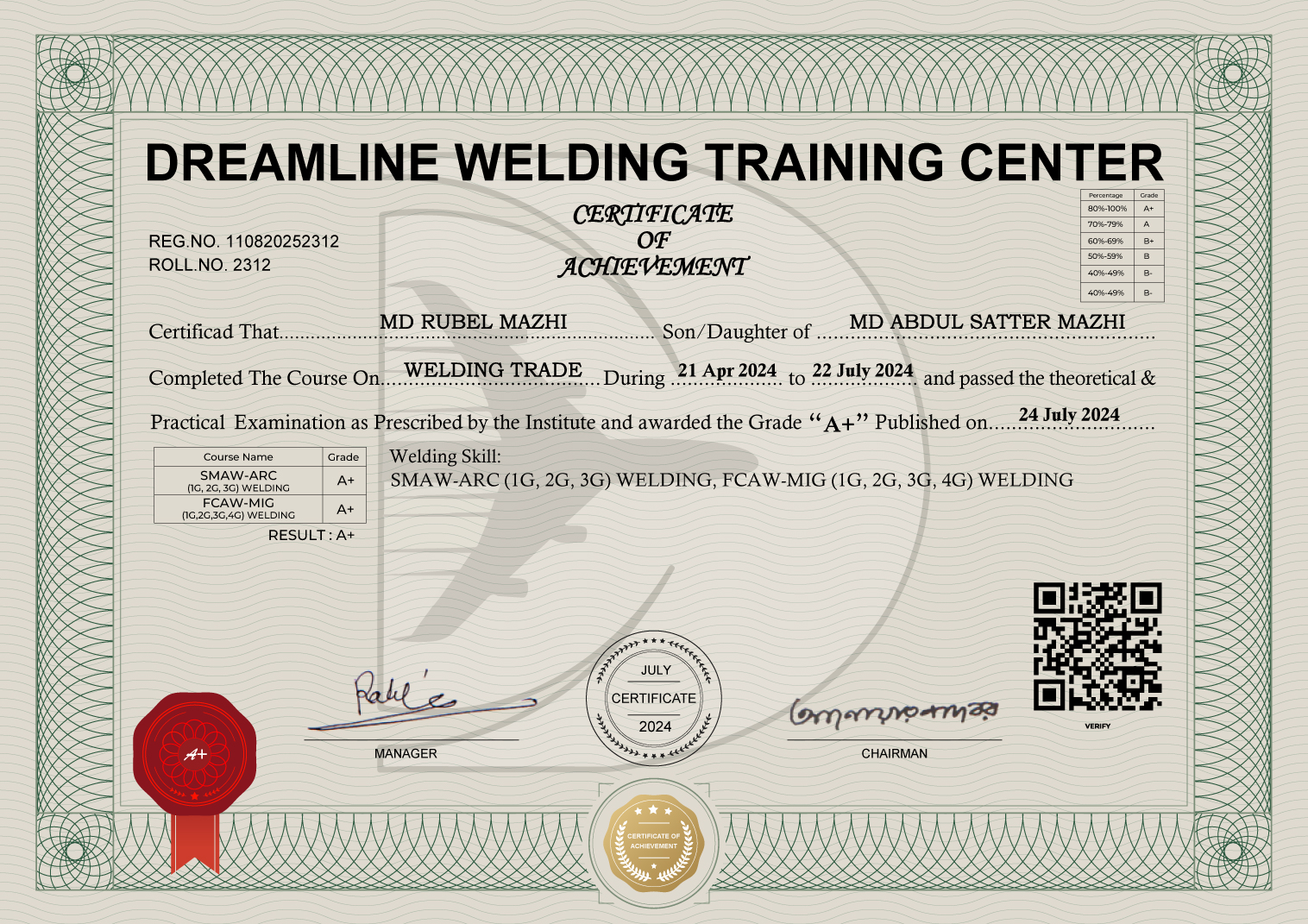 ROLL: 2312REG: 110820252312 STUDENT NAME: MD RUBEL MAZHIFATHER'S NAME: MD ABDUL SATTER MAZHIMOTHER'S NAME: FATEMA BEGUMDATE OF BIRTH: 01 JAN 1996ADDRESS: BAGERHATPASSPORT: A09312151SKILL: SMAW-ARC (1G, 2G, 3G) WELDING, FCAW-MIG (1G, 2G, 3G, 4G)GRADE: A+ CERTIFICATE DOWNLOAD