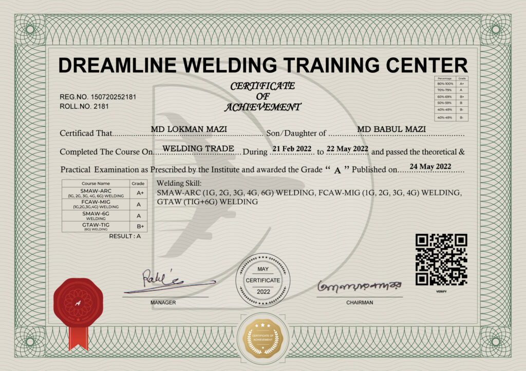 ROLL: 2181REG: 150720252181 STUDENT NAME: MD LOKMAN MAZIFATHER'S NAME: MD BABUL MAZIMOTHER'S NAME: MST MASURA BEGUMDATE OF BIRTH: 10 FEB 1990ADDRESS: JHALKATISKILL: SMAW-ARC (1G, 2G, 3G, 4G, 6G) WELDING, FCAW-MIG (1G, 2G, 3G, 4G) WELDING, GTAW (TIG+6G) WELDINGGRADE: A CERTIFICATE DOWNLOAD