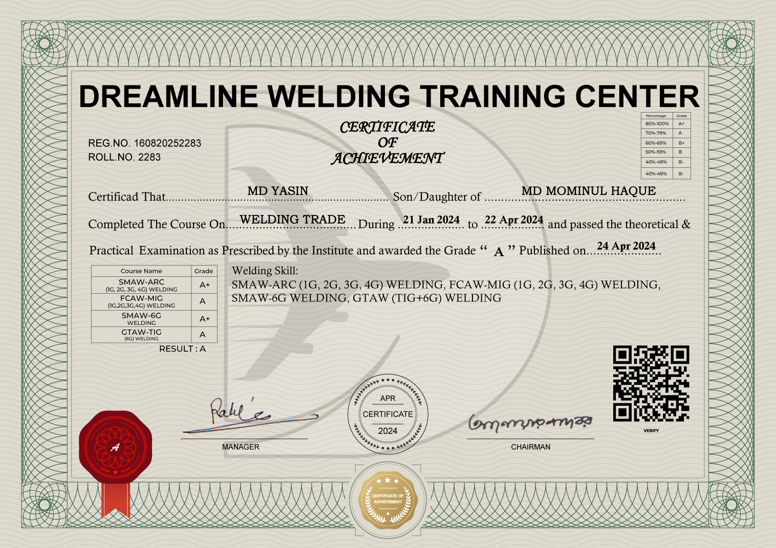 SKILL: SMAW-ARC (1G, 2G, 3G, 4G) WELDING, FCAW-MIG (1G, 2G, 3G, 4G) WELDING, SMAW-6G WELDING, GTAW (TIG+6G) WELDING