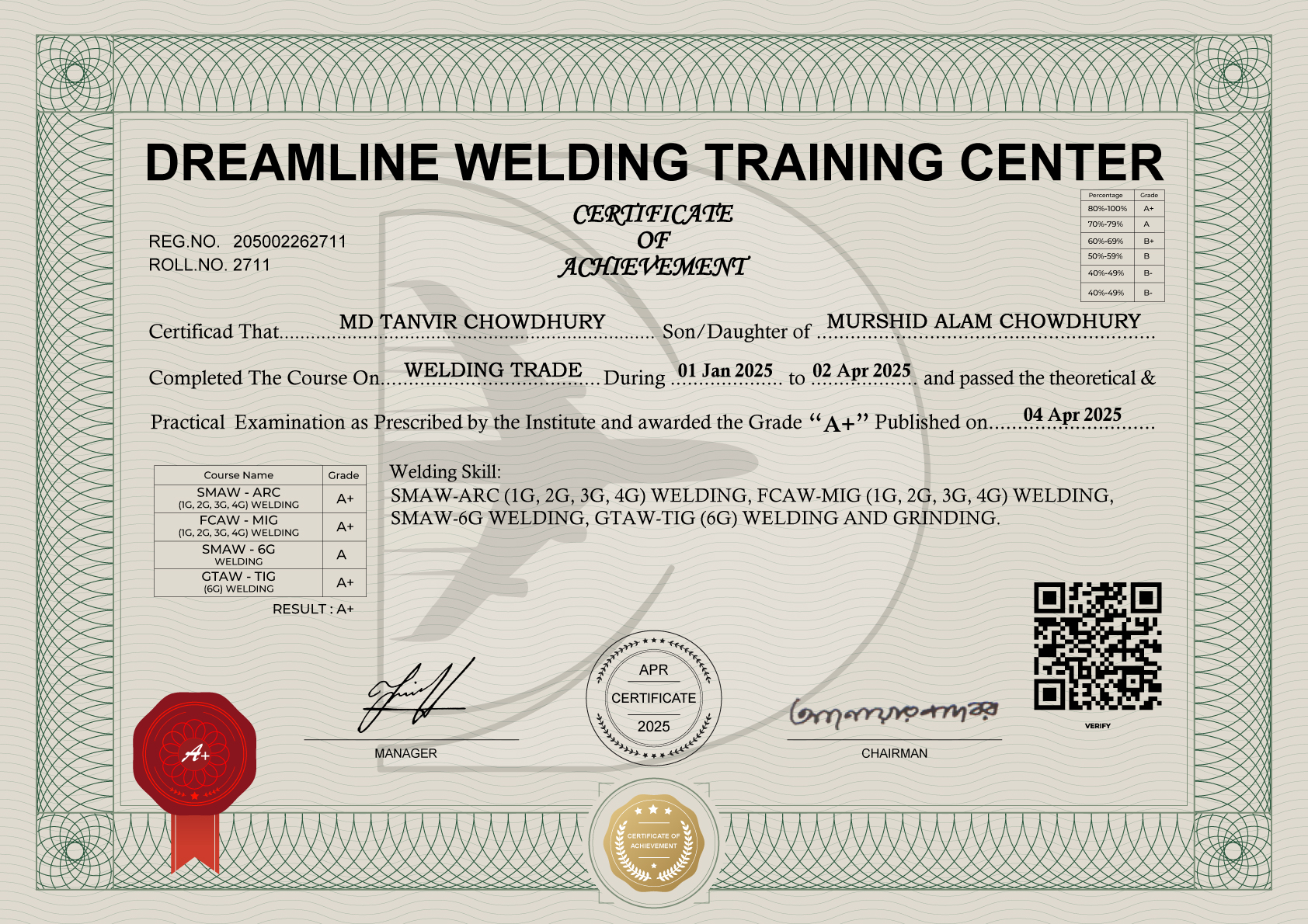 SKILL : SMAW-ARC (1G, 2G, 3G, 4G) WELDING, FCAW-MIG (1G, 2G, 3G, 4G) WELDING,